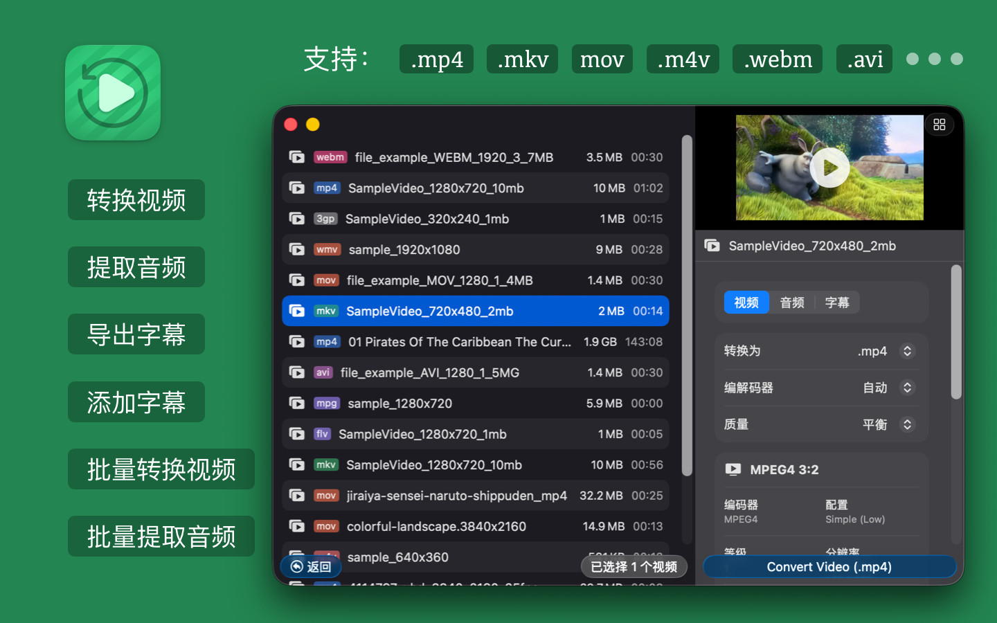 Videoer 是一款功能强大的视频格式转换工具,支持 MP4、MKV、M4V、MOV、WEBM、AVI、GIF、3GP、FLV、MPG 等格式之间的相互转换。无论是单个文件转换还是批量处理,都能轻松完成。同时,Videoer 还提供音频提取、字幕管理等多种实用功能,让你的视频处理更加高效便捷。
