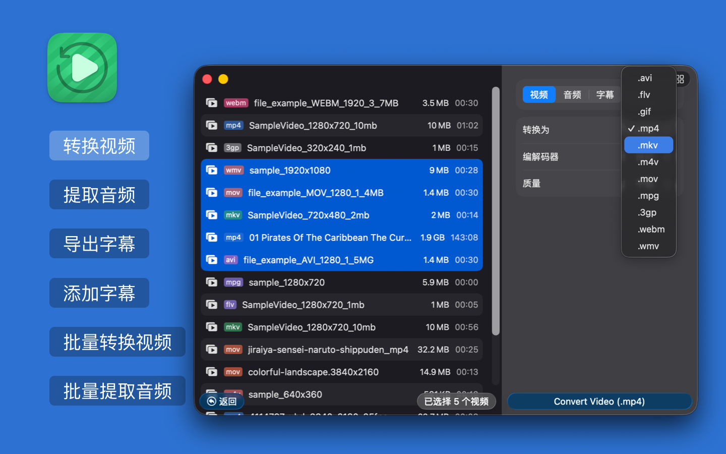 ■ 转换视频 - 轻松转换各种主流视频格式,如 MP4、MKV、M4V、MOV、WEBM、AVI、GIF、3GP、FLV、MPG。