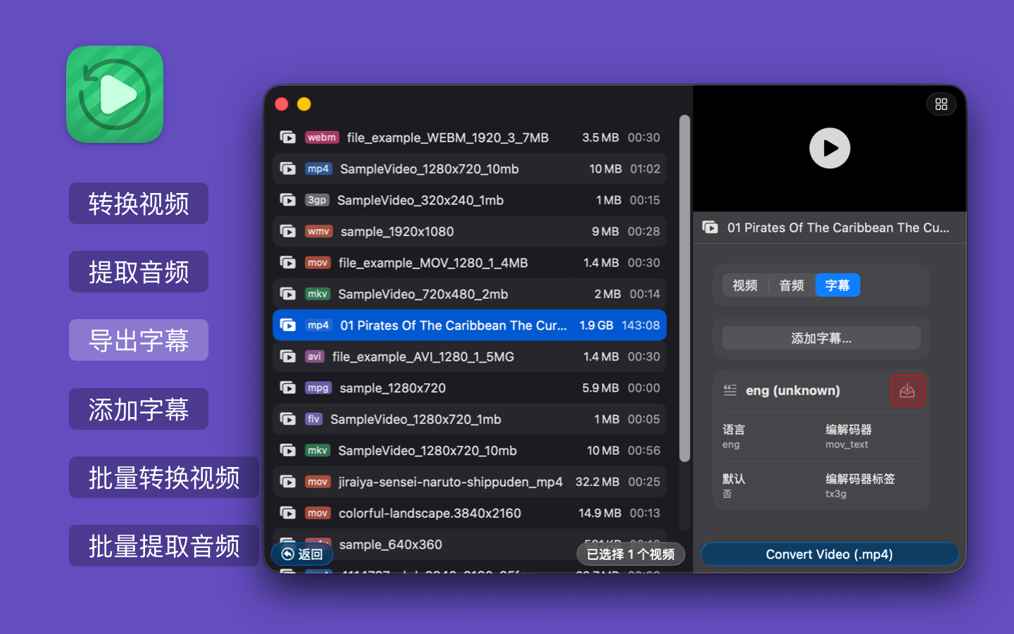 ■ 导出字幕 - 解析并提取视频内嵌或外挂的字幕文件(如 SRT、ASS、VTT)。